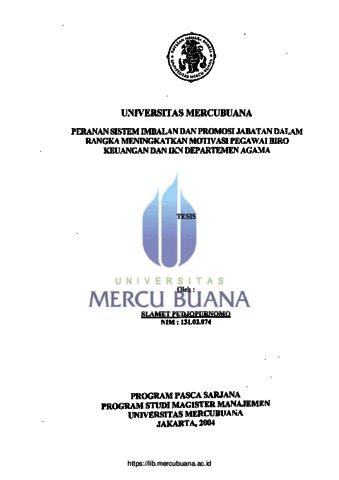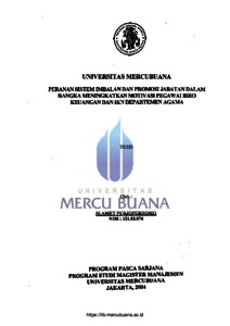 PUDJOPURNOMO, SLAMET (2004) PERANAN SISTEM IMBALAN DAN PROMOSI JABATAN DALAM RANGKA MENINGKATKAN MOTIVASI PEGAWAI BIRO KEUANGAN DAN IKN DEPARTEMEN AGAMA. S2 thesis, Universitas Mercu Buana Jakarta.