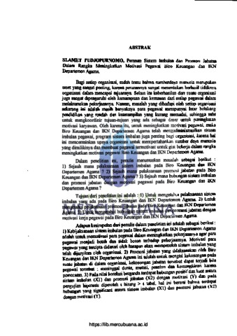 SLAMET PUDJOPURNOMO, Peranan Sistem Imbalan dan Promosi Jabatan Dalam Rangka Meningkatkan Motivasi Pegawai Biro Keuangan dan IKN Departemen Agama. Bagi setiap organisasi, sudah tentu bahwa sumberdaya manusia merupakan asset yang sangat penting, karena peranannya sangat menentukan berhasil tidaknya organisasi dalam mencapai tujuannya. Selain itu keberhasilan dari suatu organisasi juga sangat dipengaruhi oleh kemampuan dan kemauan dari setiap pegawai dalam. melaksanakan pekerjaannya. Namun, masalah yang dihadapi oleh setiap organisasi sekarang ini adalah masih banyaknya para pegawai mempunyai latar belakang pendidikan yang rendah dan keterampilan yang kurang memadai, sehingga sulit untuk mengkoordinir tujuan-tujuan yang ada sebaga dasar untuk peningkatan motivasi karyawan. Oleh karena itu, untuk meningkatkan motivasi pegawai, maka Biro Keuangan dan IKN Departemen Agama telah mengadministrasikan sistem imbalan pegawai, program sistem imbalan juga penting bagi organisasi, karena hal ini mencerminkan upaya organisasi untuk mempertahankan sumber daya manusia yang dimilikinya dan membuat pegawai termotivasi untuk giat bekerja dalam rangka meningkatkan motivasi pegawai Biro Keuangan dan IKN Departemen Agama. Dalam penelitian ini, penulis merumuskan masalah sebagai berikut: 1) Sejauh mana pelaksanaan sistem imbalan pada Biro Keuangan dan IKN Departemen Agama ? 2) Sejauh mana pelaksanaan promosi jabatan pada Biro Keuangan dan IKN Departemen Agama 73) Sejauh masa hubungan sistem imbalan dan promosi jabatan dengan motivasi pegawai pada Biro Keuangan dan IKN Departemen Agama? Tujuan dari penelitian ini adalah 1) Untuk mengetahui pelaksanaan sistem imbalan yang ada pada Biro Keuangan dan IKN Departemen Agama 2) Untuk mengetahui pelaksaruan promosi jabatan pada Biro Keuangan dan IKN Departemen Agama 3) Umak mengetahui hubungan sistem imbalan dam promosi jabatan dengan motivasi kerja pegawai pada Biro Keuangan dan IKN Departemen Agama Adapun kesimpulan dari penulis dalam penelitian ini adalah sebagai berikut: 1) Kebijaksanaan sistem imbalan pada Biro Keuangan dan IKN Departemen Agama adalah untuk memotivasi para pegawai dalam meningkatkan pekerjaannya agar para pegawai menjadi betah dan tidak bosan terhadap pekerjaannya. Motivasi para pegawai yang tercipta didasari oleh harapan akan memperoleh sistem imbalan yang telah dijanjikan oleh organisasi. 2) Promosi jabatan yang dilaksanakan oleh Biro Keuangan dan IKN Departemen Agama ini adalah untuk mengisi kekosongan pada suatu jabatan di dalam organisasi, kekosongan jabatan tersebut dapat terjadi bila pegawai tersebut meninggal dunia, mutasi, pensiun dan kemungkinan karena pemecatan. 3) Pada nilai korelasi berganda terdapat hubungan positif dan kuat antara sistem imbalan (X1) dan promosi jabatan (X2) dengan motivasi (Y) dan pada pengujian hipotesis diperoleh thitungt tabel, hal ini berarti bahwa terdapat hubungan yang significant antara sistem imbalan (X1) dan promosi jabatan (X2) dengan motivasi (Y).