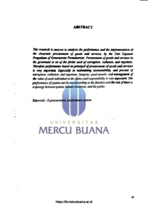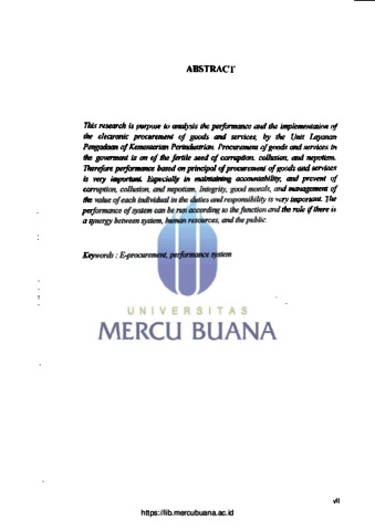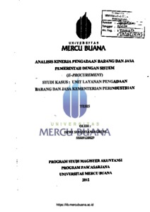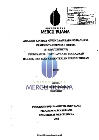 SULISTIANINGRUM, DEWI (2012) ANALISIS KINERJA PENGADAAN BARANG DAN JASA PEMERINTAH DENGAN SISTEM (E-PROCUREMENT) STUDI KASUS: UNIT LAYANAN PENGADAAN BARANG DAN JASA KEMENTERIAN PERINDUSTRIAN. S2 thesis, Universitas Mercu Buana Jakarta.