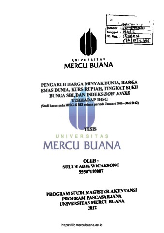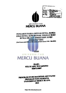 Wicaksono, Suluh Adil (2013) Pengaruh Harga Minyak Dunia,Harga Emas Dunia,Kurs Rupiah,Tingkat Suku Bangsa SBI,Dan Indeks Down Jones Terhadap IHSG (Studi kasus pada IHSG di BEI selama periode januari 2006-2012). S2 thesis, Universitas Mercu Buana.