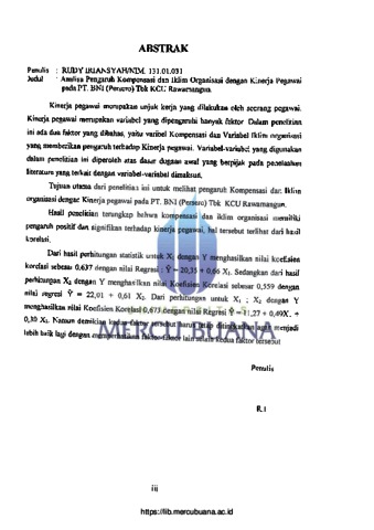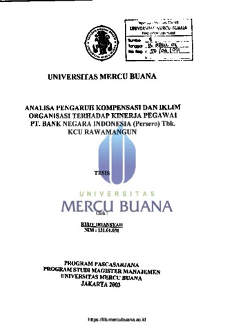 IRIANSYAH, RUDY (2003) ANALISA PENGARUH KOMPENSASI DAN IKLIM ORGANISASI TERHADAP KINERJA PEGAWAI PT. BANK NEGARA INDONESIA (Persero) Tbk. KCU RAWAMANGUN. S2 thesis, Universitas Mercu Buana Jakarta.