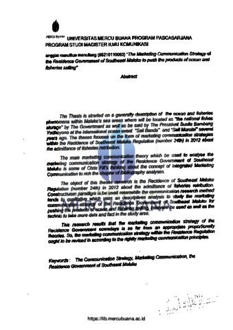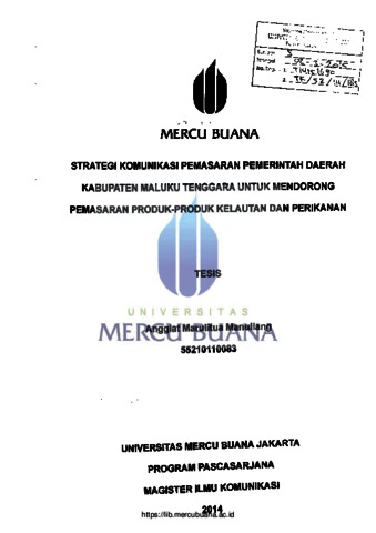 MANULLANG, ANGGIAT MARULITUA (2014) STRATEGI KOMUNIKASI PEMASARAN PEMERINTAH DAERAH KABUPATEN MALUKU TENGGARA UNTUK MENDORONG PEMASARAN PRODUK-PRODUK KELAUTAN DAN PERIKANAN. S2 thesis, Universitas Mercu Buana Jakarta.