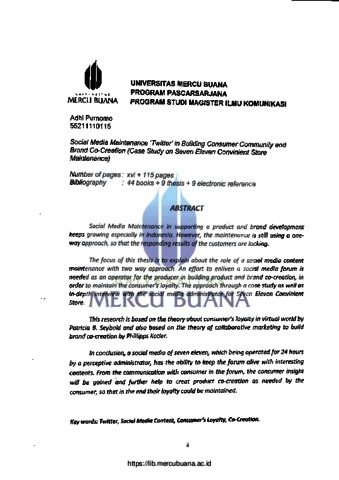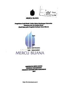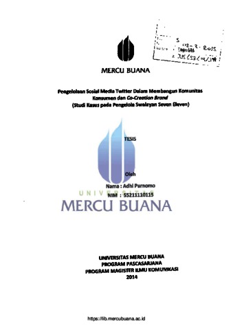 PURNOMO, ADHI (2014) PENGELOLAAN SOSIAL MEDIA TWITTER DALAM MEMBANGUN KOMUNITAS KONSUMEN DAN CO-CREATION BRAND (Studi Kasus Pada Pengelola Swalayan Seven Eleven). S2 thesis, Universitas Mercu Buana Jakarta.