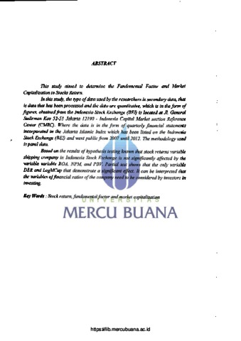 Penelitian ini bertujuan untuk mengetahui pengaruh Faktor Fundamental dan Nilai Kapitalisasi Pasar terhadap Return Saham. Pada penelitian ini jenis data yang digunakan oleh peneliti adalah data sekunder, yaitu data yang sudah diolah dan bersifat kuantitatif yaitu merupakan data yang berupa angka, yang didapat dari Bursa Efek Indonesia (BEI) yang beralamat di Jl. Jendral sudirman Kav 52-53 Jakarta 12190 Indonesia dibagian Pusat Referensi Pasar Modal (PRPM). Dimana data tersebut berupa laporan keuangan perusahaan triwulanan yang tergabung dalam Jakarta Islamic Index yang telah terdaftar di Bursa Efek Indonesia (BEI) dan go public dari tahun 2007 sampai dengan tahun 2012. Metodologi yang dipergunakan adalah panel data. Berdasarkan hasil pengujian hipotesis diketahui bahwa variabel return saham perusahaan pelayaran di Bursa Efek Indonesia tidak dipengaruhi secara signifikan oleh variabel variabel ROA, NPM, dan PBV. Pengujian secara parsial diperoleh bahwa hanya variabel DER dan LogMCap saja yang menunjukkan pengaruh yang signifikan. Hal ini dapat diinterpretasikan bahwa variabel rasio-rasio keuangan perusahaan tersebut perlu diperhatikan oleh investor dalam berinvestasi. Kata kunci: Return saliam, faktor fundamental dan nilai kapitalisasi pasar N