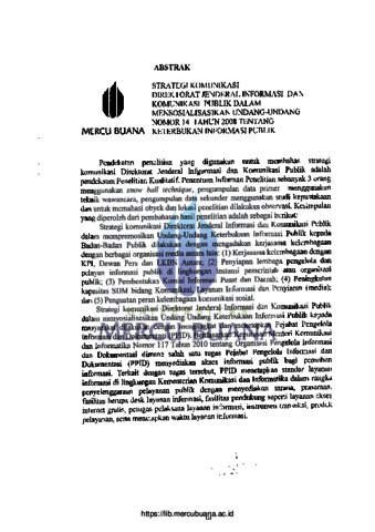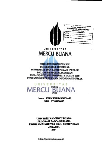 FERDIANSYAH, FERY (2014) STATEGI KOMUNIKASI DIREKTORAT JENDRAL INFORMASI DAN KOMUNIKASI PUBLIK DALAM MENSOSIALISASIKAN UNDANG-UNDANG NOMOR 14 TAHUN 2008 TENTANG KETERBUKAAN INFORMASI PUBLIK. S2 thesis, Universitas Mercu Buana Jakarta.