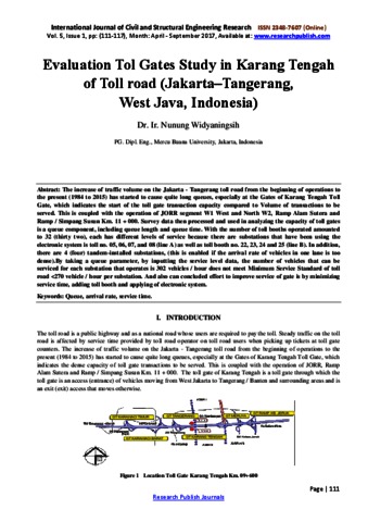 Widyaningsih, Nunung (2017) EVALUATION TOL GATES STUDY IN KARANG TENGAH OF TOLL ROAD (JAKARTA–TANGERANG, WEST JAVA, INDONESIA. International Journal of Civil and Structural Engineering Research, 5 (1). pp. 111-117. ISSN 2348-7607