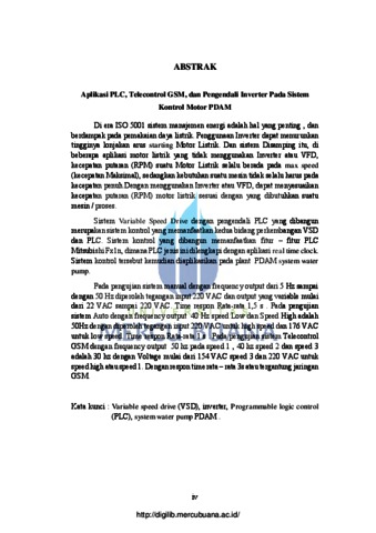 Di era ISO 5001 sistem manajemen energi adalah hal yang penting , dan berdampak pada pemakaian daya listrik. Penggunaan Inverter dapat menurunkan tingginya lonjakan arus starting Motor Listrik. Dan sistem Disamping itu, di beberapa aplikasi motor listrik yang tidak menggunakan Inverter atau VFD, kecepatan putaran (RPM) suatu Motor Listrik selalu berada pada max speed (kecepatan Maksimal), sedangkan kebutuhan suatu mesin tidak selalu harus pada kecepatan penuh.Dengan menggunakan Inverter atau VFD, dapat menyesuaikan kecepatan putaran (RPM) motor listrik sesuai dengan yang dibutuhkan suatu mesin / proses. Sistem Variable Speed Drive dengan pengendali PLC yang dibangun merupakan sistem kontrol yang memanfaatkan kedua bidang perkembangan VSD dan PLC. Sistem kontrol yang dibangun memanfaatkan fitur – fitur PLC Mitsubishi Fx1n, dimana PLC jenis ini dilengkapi dengan aplikasi real time clock. Sistem kontrol tersebut kemudian diaplikasikan pada plant PDAM system water pump. Pada pengujian sistem manual dengan frequency output dari 5 Hz sampai dengan 50 Hz diperoleh tegangan input 220 VAC dan output yang variable mulai dari 22 VAC sampai 220 VAC. Time respon Rata-rata 1,5 s . Pada pengujian sistem Auto dengan frequency output 40 Hz speed Low dan Speed High adalah 50Hz dengan diperoleh tegangan input 220 VAC untuk high speed dan 176 VAC untuk low speed. Time respon Rata-rata 1 s . Pada pengujian sistem Telecontrol GSM dengan frequency output 50 hz pada speed 1 , 40 hz speed 2 dan speed 3 adalah 30 hz dengan Voltage mulai dari 154 VAC speed 3 dan 220 VAC untuk speed high atau speed 1. Dengan respon time rata – rata 3s atau tergantung jaringan GSM. Kata kunci : Variable speed drive (VSD), inverter, Programmable logic control (PLC), system water pump PDAM