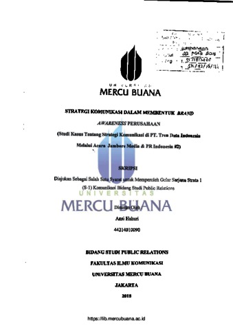 HAHURI, ANSI (2018) STRATEGI KOMUNIKASI DALAM MEMBENTUK BRAND AWARENESS PERUSAHAAN (Studi Kasus Tentang Strategi Komunikasi di PT. Tren Data Indonesia Melalui Acara Jambore Media & PR Indonesia #2). S1 thesis, Universitas Mercu Buana Jakarta.