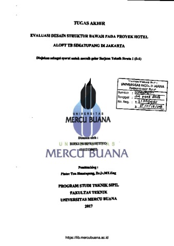 PRASETIYO, RIFKI NUR (2017) EVALUASI DESAIN STRUKTUR BAWAH PADA PROYEK HOTEL ALOFT TB SIMATUPANG DI JAKARTA. S1 thesis, Universitas Mercu Buana Jakarta.