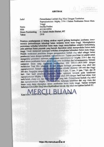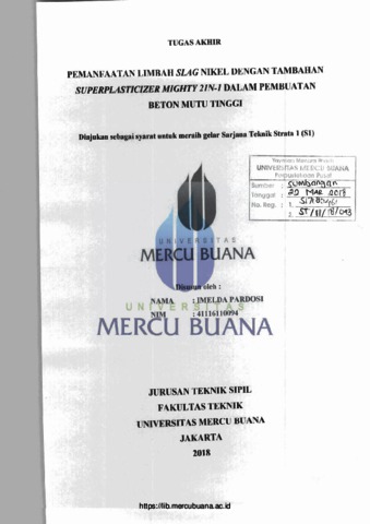 PARDOSI, IMELDA (2018) PEMANFAATAN LIMBAH SLAG NIKEL DENGAN TAMBAHAN SUPERPLASTICIZER MIGHTY 21N-1 DALAM PEMBUATAN BETON MUTU TINGGI. S1 thesis, Universitas Mercu Buana Jakarta.