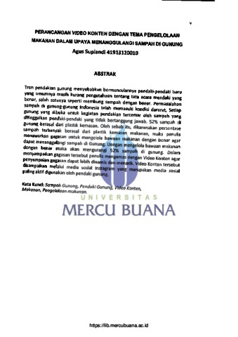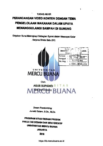 SUPIANDI, AGUS (2018) PERANCANGAN VIDEO KONTEN DENGAN TEMA PENGELOLAAN MAKANAN DALAM UPAYA MENANGGULANGI SAMPAH DI GUNUNG. S1 thesis, Universitas Mercu Buana Jakarta.