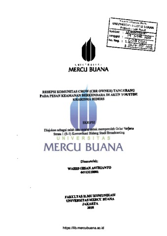 ASTRIANTO, WAHID IHSAN (2018) RESEPSI KOMUNITAS CROW (CBR OWNER) TANGERANG PADA PESAN KEAMANAN BERKENDARA DI AKUN YOUTUBE KHARISMA RIDERS. S1 thesis, Universitas Mercu Buana Jakarta.