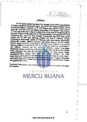 PT ISP adalah sebuah Perusahaan Jasa Inspeksi Teknik (PJIT) yang bergerak di bidang pemeriksaan alat angkat angkut. Saat ini PT ISP sedang menjalani proyek pemeriksaan Offshore Container di PT SLB dengan masa kontrak 3 tahun yang di mulai dari awal tahun 2017 dan diminta menyediakan 2 tim inspeksi. Pada awalnya PT SLB yang terdiri dari 5 segmen berada di dua lokasi yaitu di Pulogadung dan di Cilandak. Dengan kondisi seperti itu PT ISP menempatkan 1 tim inspeksi di PT SLB Pulogadung dan 1 tim di PT SLB Cilandak. Namun,pada awal 2018 nanti seluruh segmen dari PT SLB akan digabung kedalam satu base di Cikarang. Dengan bergabungnya keseluruhan segmen di Ciakarang, maka perlu adanya perancangan penjadwalan inspeksi Offshore Container agar beban kerja ke dua tim merata. Diawali dengan melakukan pengumpulan data-data jumlah Offshore Container per segmen, jumlah hari kerja ditahun 2018 dan perhitungan waktu baku pemeriksaan 1 unit Offshore Container per tim, kemudian dilakukan analisa perancangan penjadwalan dengan metode Line of Balance sehingga diperoleh bahwa ada beberapa bulan kekurangan jam kerja dan ada yang kelebihan jam kerja. Dengan adanya ketidakseimbangan tersebut maka pada bulan dengan kelebihan jam kerja dimanfaatkan untuk memulai pekerjaan inspeksi lebih awal bagi dan pada bulan –bulan yang masih kekurangan jam kerja diadakan jam lembur. Sehiggan didapatkan hasil berupa penjadwalan tenaga kerja dan detail jam lembur yang dibutuhkan dengan menggunakan Bar Chart.