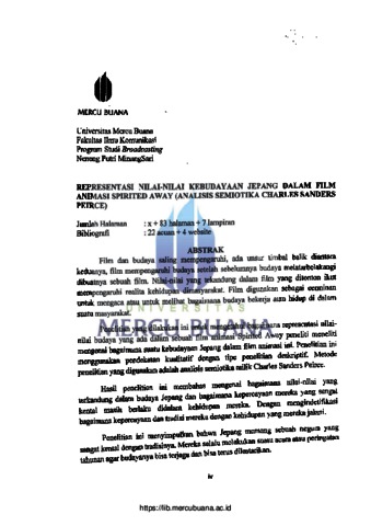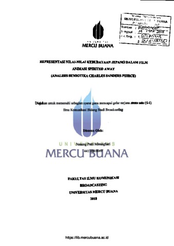 SARI, NENENG PUTRI MINANG (2018) REPRESENTASI NILAI-NILAI KEBUDAYAAN JEPANG DALAM FILM ANIMASI SPIRITED AWAY (ANALISIS SEMIOTIKA CHARLES SANDERS PEIRCE). S1 thesis, Universitas Mercu Buana Jakarta.