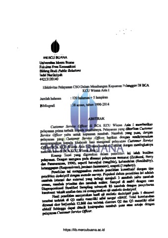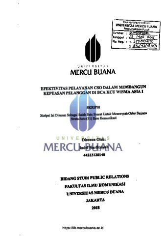NURFITRIYAH, INDRI (2018) EFEKTIVITAS PELAYANAN CSO DALAM MEMBANGUN KEPUASAN PELANGGAN DI BCA KCU WISMA ASIA I. S1 thesis, Universitas Mercu Buana Jakarta.