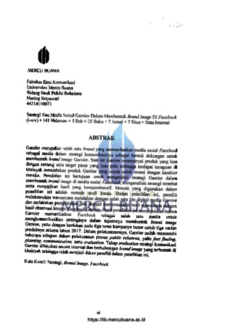 Garnier merupakan salah satu brand yang memanfaatkan media sosial Facebook sebagai media dalam strategi komunikasinya sebagai bentuk dukungan untuk membentuk brand image Garnier. Saat ini Garnier mempunyai produk yang luas dengan rentang usia target pasar yang luas pula sehingga terdapat keraguan di khalayak menentukan produk Garnier yang cocok untuk sesuai dengan karakter mereka. Penelitian ini bertujuan untuk mengetahui strategi Garnier dalam membentuk brand image di media sosial Facebook, menganalisis strategi tersebut serta menyajikan hasil yang komperehensif. Metode yang digunakan dalam penelitian ini adalah metode studi kasus. Dalam penelitian ini, peneliti melaksanakan wawancara mendalam dengan salah satu tim digital media Garnier dan melakukan pemeriksaan data dengan menyesuaikan hasil wawancara dengan hasil observasi konten Facebook Garnier. Hasil penelitian ini menunjukkan bahwa Garnier memanfaatkan Facebook sebagai salah satu media untuk mengkomunikasikan strateginya dalam tujuannya membentuk brand image Garnier, yaitu dengan berfokus pada tiga tema kampanye besar untuk tiga varian produknya selama tahun 2017. Dalam pelaksanaannya, Garnier sudah memenuhi beberapa tahapan dalam pelaksanaan proses public relations, yaitu fact finding, planning, communication, serta evaluation. Tahap evaluation strategi komunikasi Garnier dilakukan secara internal dan berhubungan brand image yang terbentuk di khalayak sehingga tidak menjadi fokus peneliti dalam penelitian ini.
