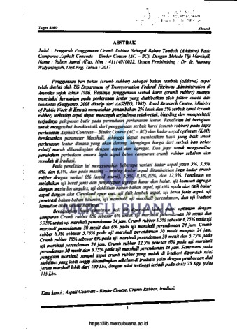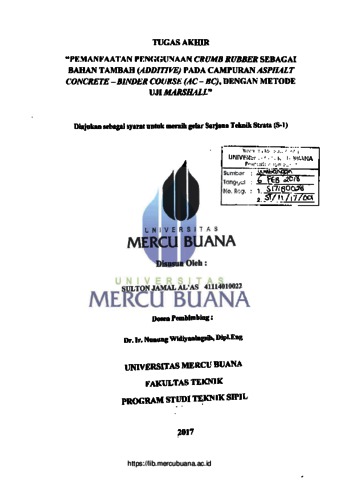 AL'AS, SULTON JAMAL (2018) PEMANFAATAN PENGGUNAAN CRUMB RUBBER SEBAGAI BAHAN TAMBAH (ADDITIVE) PADA CAMPURAN ASPHALT CONCRETE – BINDER COURSE (AC – BC), DENGAN METODE UJI MARSHALL. S1 thesis, Universitas Mercu Buana Jakarta.