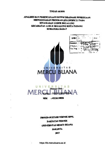 YOHANDRA, YOGI (2017) ANALISIS DAN PERENCANAAN SISTEM DRAINASE PERKOTAAN MENGGUNAKAN PROGRAM EPA SWMM 5.1 PADA KELURAHAN LUBUK BEGALUNG KECAMATAN LUBUK BEGALUNG KOTA PADANG SUMATERA BARAT. S1 thesis, Universitas Mercu Buana Jakarta.