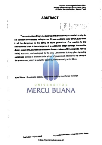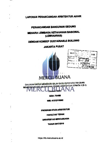 FAHMI, DZUL (2018) PERANCANGAN BANGUNAN GEDUNG MENARA LEMBAGA KETAHANAN NASIONAL (LEMHANNAS) DENGAN KONSEP SUSTAINABLE BUILDING JAKARTA PUSAT. S1 thesis, Universitas Mercu Buana Jakarta.