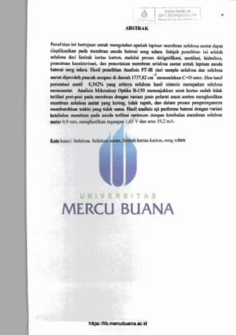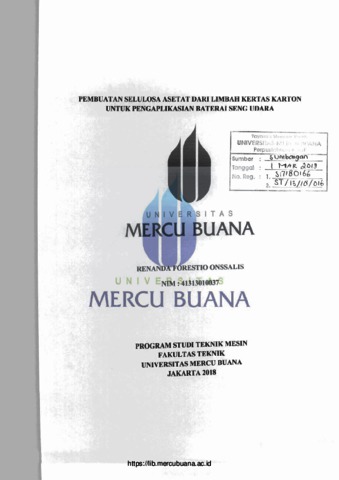 ONSSALIS, RENANDA FORESTIO (2018) PEMBUATAN SELULOSA ASETAT DARI LIMBAH KERTAS KARTON UNTUK PENGAPLIKASIAN BATERAI SENG UDARA. S1 thesis, Universitas Mercu Buana Jakarta.