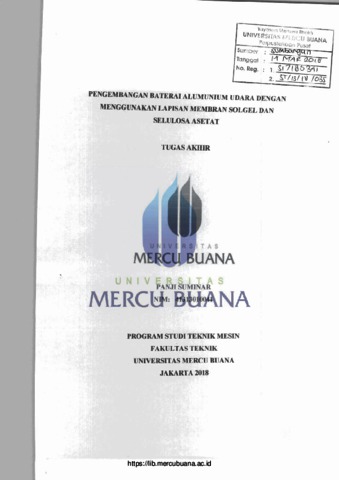 SUMINAR, PANJI (2018) PENGEMBANGAN BATERAI ALUMINIUM UDARA DENGAN MENGGUNAKAN LAPISAN MEMBRAN SOLGEL DAN SELULOSA ASETAT. S1 thesis, Universitas Mercu Buana Jakarta.
