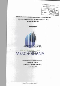 | Uncontrolled Keywords: | kebutuhan masyarakat meningkat, Baterai Alumunium Udara, Membran Solgel dan Selulosa Asetat |