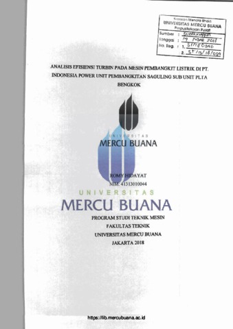 HIDAYAT, ROMY (2018) ANALISIS EFISIENSI TURBIN PADA MESIN PEMBANGKIT LISTRIK DI PT. INDONESIA POWER UNIT PEMBANGKITAN SAGULING SUB UNIT PLTA BENGKOK. S1 thesis, Universitas Mercu Buana Jakarta.
