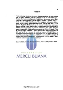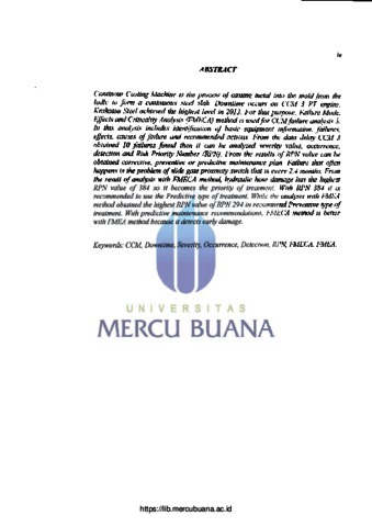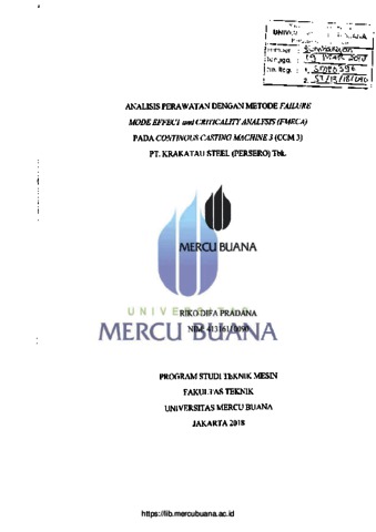 PRADANA, RIKO DIFA (2018) ANALISIS PERAWATAN DENGAN METODE FAILURE MODE EFFECT AND CRITICALITY ANALYSIS (FMECA) PADA CONTINOUS CASTING MACHINE 3 (CCM 3) PT. KRAKATAU STEEL (PERSERO) Tbk. S1 thesis, Universitas Mercu Buana Jakarta.