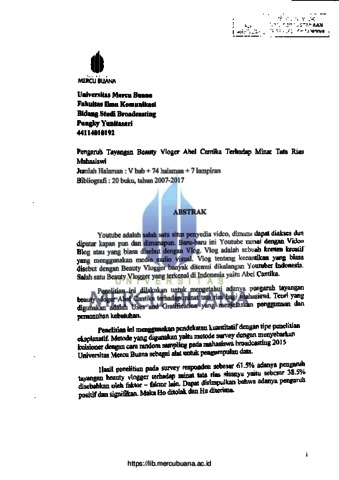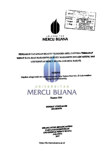YUNITASARI, PUNGKY (2018) PENGARUH TAYANGAN BEAUTY VLOGGER ABEL CANTIKA TERHADAP MINAT TATA RIAS MAHASISWI (Survey Mahasiswi Broadcasting 2015 Universitas Mercu Buana Jakarta Barat). S1 thesis, Universitas Mercu Buana Jakarta.