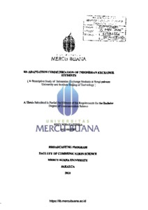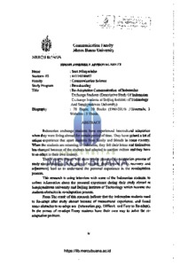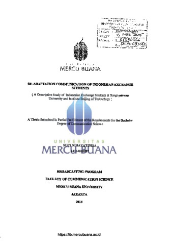 NIHAYATINISA, SUCI (2018) RE-ADAPTATION COMMUNICATION OF INDONESIAN EXCHANGE STUDENTS (A Descriptive Study of Indonesian Exchange Students at Sungkyukwan University and Institute Beijing of Technology). S1 thesis, Universitas Mercu Buana Jakarta.