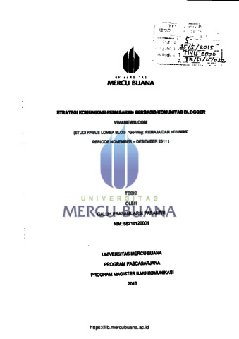 Parantri, Galuh Prasamuarsi (2013) STRATEGI KOMUNIKASI PEMASARAN BERBASIS KOMUNITAS BLOGGER VIVANEWS.COM (STUDI KASUS LOMBA BLOG “Go-Vlog: REMAJA DAN HIV/AIDS” PERIODE NOVEMBER – DESEMBER 2011 ). S2 thesis, Universitas Mercu Buana Jakarta-Menteng.