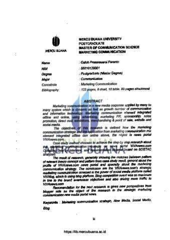 Komunikasi pemasaran di sebuah perusahaan berbasis new media dilakukan dengan basis many to many dinamis sesuai dengan perkembangan komunikasi dan teknologi. Elemen komunikasi pemasaran terintegrasi offline dan online yang digunakan yaitu advertising, marketing PR, sponsorship, sales promotion, direct mail, exhibitions, merchandising & point of sale, website dan social media. Penelitian ini bertujuan untuk membahas strategi komunikasi pemasaran dan penerapan dari elemen-elemen marketing communication mix terintegrasi offline dan online di atas, dengan obyek penelitian portal berita VIVAnews.com. Guna mencapai pembahasan strategi tersebut, digunakan metode penelitian studi kasus dengan teknik pengumpulan data : wawancara, observasi dan dokumentasi dengan teknik analisis pola perjodohan yang dianalisis secara kualitatif- deskriptif berdasarkan model SOSTAC. Hasil penelitian secara umum menunjukkan kesesuaian antara polapola konseptual teori yang relevan dengan pola-pola temuan studi kasus, baik secara umum profil perusahaan portal berita VIVAnews.com maupun secara khusus mengenai strategi pemasarannya. Dari kesesuaiaan pola tersebut dapat disimpulkan bahwa strategi komunikasi pemasaran VIVAnews.com menekankan pada kekuatan media sosial melalui platform VIVAlog. Kegiatan lomba blog dengan sasaran para blogger dirasa sangat maksimal hasilnya dalam pencapaian tujuan brand awareness dan secara tidak langsung meningkatkan jumlah kunjungan pembaca ke portal berita VIVAnews.com Rekomendasi untuk penelitian berikutnya dapat melanjutkan penelitian ini dengan menjadikan blogger sebagai objek penelitian dalam sebuah strategi komunikasi pemasaran new media portal news.