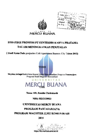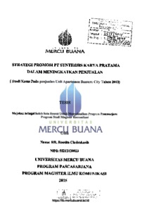 CINDRAKASIH, RR. ROOSITA (2015) STRATEGI PROMOSI PT. SYNTHESIS KARYA PRATAMA DALAM MENINGKATKAN PENJUALAN (STUDI KASUS PADA PENJUALAN UNIT APARTEMEN BASSURA CITY TAHUN 2013). S2 thesis, Universitas Mercu Buana Jakarta-Menteng.