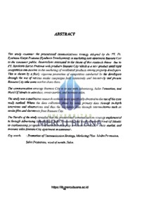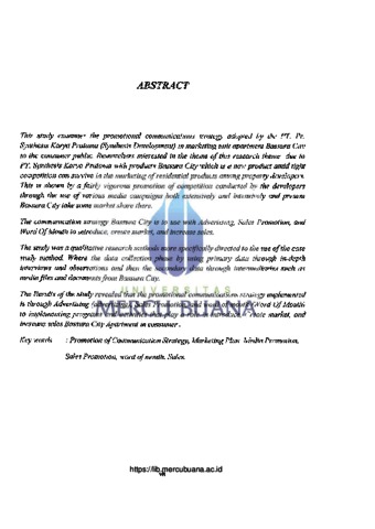 Penelitian ini meneliti tentang strategi komunikasi promosi yang diterapkan oleh PT. Synthesis Karya Pratama ( Synthesis Development ) dalam memasarkan unit Apartemen Bassura City kepada konsumen masyarakat luas. Peneliti tertarik untuk mengangkat tema penelitian ini dikarenakan PT. Synthesis Karya Pratama dengan produknya Bassura City yang merupakan produk baru ditengah persaingan sangat ketat dapat bertahan dalam pemasaran produk perumahan diantara para developer property . Hal ini ditunjukkan oleh persaingan promosi yang cukup gencar dilakukan oleh para pengembang melalui penggunaan berbagai media promosi baik secara ekstensif maupun intensif dan Bassura City hadir mengambil sebagian pangsa pasar yang ada. Adapun strategi komunikasi promosi yang dilakukan oleh Bassura City adalah dengan Periklanan ( Advertizing ), Sales Promotion , dan Getok Tular ( Word Of Mouth ) untuk memperkenalkan, memasarkan, dan meningkatkan penjualan. Penelitian ini mempergunakan metode penelitian kualitatif yang secara spesifik lebih diarahkan kepada penggunaan metode studi kasus. Dimana tahap pengumpulan data dengan menggunakan data primer melalui wawancara mendalam dan observasi dan kemudian data sekunder melalui media perantara berupa arsip dan dokumen dari Bassura City. Hasil penelitian mengungkapkan bahwa strategi komunikasi promosi yang dijalankan adalah melalui Periklanan ( Advertizing ), Sales Promotion , dan Getok Tular ( Word Of Mouth ) dengan melaksanakan program dan kegiatan event yang berperan dalam memperkenalkan, memasarkan, dan meningkatkan penjualan Apartemen Bassura City di konsumen masyarakat luas. Kata Kunci : Strategi Komunikasi Promosi, Marketing Plan, Media Promosi, Sales Promotion, Getok Tular, Penjualan. This study examines the promotional communications strategy adopted by the PT. Pr. Synthesis Karya Pratama (Synthesis Development) in marketing unit apartment Bassura City to the consumer public. Researchers interested in the theme of this research theme due to PT. Synthesis Karya Pratama with products Bassura City which is a new product amid tight competition can survive in the marketing of residential products among property developers. This is shown by a fairly vigorous promotion of competition conducted by the developers through the use of various media campaigns both extensively and intensively and present Bassura City take some market share there. The communication strategy Bassura City is to use with Advertising, Sales Promotion, and Word Of Mouth to introduce, create market, and increase sales. The study was a qualitative research methods more specifically directed to the use of the case study method. Where the data collection phase by using primary data through in-depth interviews and observations and then the secondary data through intermediaries such as media files and documents from Bassura City. The Results of the study revealed that the promotional communications strategy implemented is through Advertising (advertizing), Sales Promotion, and word of mouth (Word Of Mouth) to implementing programs and activities that play a role in introduce, Create market, and increase sales Bassura City Apartment in consumer . Key words : Promotion of Communication Strategy, Marketing Plan, Media Promotion, Sales Promotion, word of mouth, Sales.
