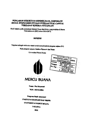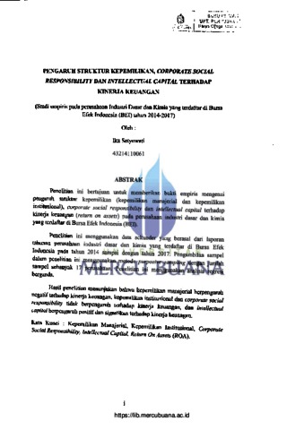SETYOWATI, IKA (2018) PENGARUH STRUKTUR KEPEMILIKAN, CORPORATE SOCIAL RESPONSIBILITY DAN INTELLECTUAL CAPITAL TERHADAP KINERJA KEUANGAN (Studi empiris pada perusahaan Industri Dasar dan Kimia yang terdaftar di Bursa Efek Indonesia (BEI) tahun 2014-2017). S1 thesis, Universitas Mercu Buana Jakarta.