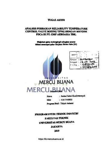 KUSFIRMANSYAH, RADEN FAHMI (2019) ANALISIS PERBAIKAN RELIABILITY TEMPERATURE CONTROL VALVE BOEING 737NG DENGAN METODE PDCA DI PT. GMF AEROASIA TBK. S1 thesis, Universitas Mercu Buana Jakarta.