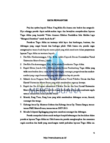 Education is a teaching that is very important for humans. Likewise, sex education is education that is important for everyone including children. From an early age, parents should teach their children about sex education. However, in reality sex education is still considered taboo and rarely discussed by Indonesian society. Though knowledge about sex education is important knowledge to be known by the community, especially children, so that children know the impact of sex. The role of parents is very important in teaching sex education because parents are right in teaching sex education to children. Perhaps, parents are confused about how to deliver sex education to their children, therefore, one of the tools that can help parents to teach sex education to their children is through the video song animation "Mengenal Sentuhan". to find out some of the many cases of sexual violence that occurred in children throughout 2019, especially knowing what can be touched and should not be touched. So that children can protect themselves from the threat of sexual violence when children are far from parents. Before making a campaign that is right on the target it is very important to know a related visual reference of the work and find data that fits the target. In this final assignment the writer uses video song animation media as a media campaign to raise awareness of sex education. Keywords: Sex Education, Video Song Animation, Sexual Violence, Campaign Pendidikan merupakan sebuah pengajaran sangat penting bagi manusia. Begitu pula Pendidikan seks merupakan pendidikan yang penting bagi semua orang termasuk anak-anak. Sejak usia dini, para orang tua seharusnya mengajarkan mengenai pendidikan seks kepada anak-anak mereka. Namun, pada kenyataannya pendidikan seks masih dianggap tabu dan jarang didiskusikan oleh masyarakat Indonesia. Padahal pengetahuan tentang pendikan seks adalah pengetahuan yang penting untuk diketahui oleh masyarakat terutama anak-anak, supaya anak-anak tahu dampak dari seks. Peran orang tua sangat penting dalam mengajarkan pendidikan seks karena orang tua yang tepat dalam mengajarkan pendidikan seks kepada anak-anak. Mungkin saja, para orang tua merasa bingung bagaimana untuk menyampaikan pendidikan seks kepada anak mereka oleh karena itu, salah satu sarana yang dapat membantu orang tua untuk mengajarkan pendidikan seks kepada anak mereka adalah melalui video lagu animasi “Mengenal Sentuhan”. Dalam video lagu animasi tersebut bertujuan untuk mengetahui beberapa banyak kasus kekerasan seksual yang terjadi pada anak-anak sepanjang tahun 2019, terutama mengetahui apa saja yang boleh disentuh dan tidak boleh disentuh. Supaya anak-anak dapat melindungi diri dari ancaman kekerasan seksual saat anak-anak jauh dari orang tua. Sebelum membuat kampanye yang tepat pada target sasaran penting sekali untuk mengetahui sebuah referensi visual yang terkait dari karya dan mencari data yang sesuai dengan target sasaran. Pada tugas ahkir ini penulis menggunakan media video lagu animasi sebagai media kampanye untuk meningkatkan kepedulian terhadap pendidikan seks. Kata Kunci: Pendidikan Seks, Video Lagu Animasi, Kekerasan Seksual, Kampanye