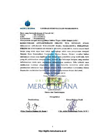 KHOLILAH, SITI (2019) KOMUNIKASI ANTARPRIBADI ORANG TUA DENGAN ANAK MELALUI APLIKASI WHATSAPP PARA MAHASISWA PERANTAU FIKOM DI UNIVERSITAS MERCU BUANA JAKARTA. S1 thesis, Universitas Mercu Buana Jakarta.