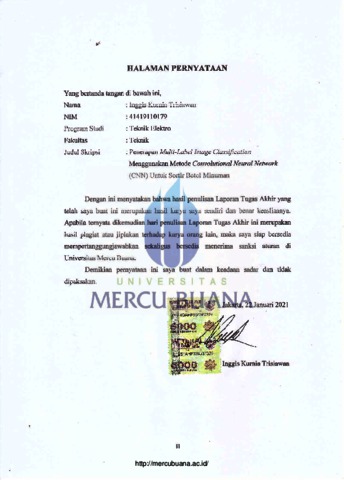 TRISIAWAN, INGGIS KURNIA (2021) PENERAPAN MULTI-LABEL IMAGE CLASSIFICATION MENGGUNAKAN METODE CONVOLUTIONAL NEURAL NETWORK (CNN) UNTUK SORTIR BOTOL MINUMAN. S1 thesis, Universitas Mercu Buana Jakarta.