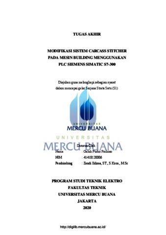 PRAKOSO, GALUH PURBO (2020) MODIFIKASI SISTEM CARCASS STITCHER PADA MESIN BUILDING MENGGUNAKAN PLC SIEMENS SIMATIC S7-300. S1 thesis, Universitas Mercu Buana.