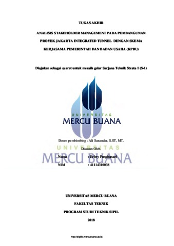 ABSTRAK Judul : Analisis Stakeholder Management Pada Pembangunan Proyek Jakarta Integrated Tunnel Dengan Skema Kerja Sama Pemerintah Dan Badan Usaha (KPBU), Nama : Febry Puspitasari, NIM : 41114310038, Dosen Pembimbing : Ali Sunandar, S.ST, MT., 2018 Proyek pembangunan Jakarta Integrated Tunnel memiliki 4 fungsi yaitu : pengendali banjir, fungsi tol, fungsi bahan baku air minum dan fungsi power plant. Perlu adanya keterlibatan stakeholder dalam pembangunan infrastruktur seperti pada Jakarta Integrated Tunnel (JIT) memiliki peran penting karena mempengaruhi tingkat keberhasilan manajemen infrastruktur. Penelitian ini bertujuan untuk mengidentifikasi stakeholder utama berikut tindakan-tindakan yang perlu dilakukan terhadap stakeholder tersebut. Pada tahap awal, daftar stakeholder dibuat dengan menggunakan metode riset seperti studi kasus dan tinjauan literatur. Langkah ini diikuti dengan memilih sumber daya dengan kriteria tertentu untuk memberikan penilaian atas setiap stakeholder yang telah terdaftar. Analisis stakeholder kemudian dilaksanakan untuk mendapatkan daftar stakeholder utama yang memiliki pengaruh signifikan terhadap Jakarta Integrated Tunnel (JIT). Kata kunci: analisis stakeholder; KPBU, Jakarta Integrated Tunnel, Pemangku Kepentingan ABSTRACT Title : Stakeholder Analysis on Project Development Jakarta Integrated Tunnel Scheme of Coorperation between Govermment and Business Entity, Name : Febry Puspitasari, Nim : 41114310038, Supervisor : Ali Sunandar,S,ST., MT., 2018 The Jakarta Integrated Tunnel development project has 4 functions, such as : flood control,toll functions, drinking water raw materials and power plant functions. There needs to be engagement for stakeholder involvement in infrastructure development such as in Jakarta Integrated Tunnel (JIT) has an important role as it affects the succes rate of infrastructure management this study aims to identify key stakeholdes and the actions that need to be taken againts those stakeholders. In the early stages, a list of stakeholders was made using research metods such as case studies and literature review. This step is followed by selecting resources with certain criteria to provide an assessment of each listed stakeholder. Stakeholder analysis is then implemented to obtain a list of key stakeholders that have a signigicant influence on the Jakarta Integrated Tunnel (JIT). Keywords : stakeholders analysis; KPBU, Jakarta Integrated Tunnel, Stakeholders