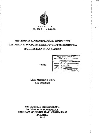 FATHIRA, MYRA MARIEZKI (2016) MISTIFIKASI DAN KOMODIFIKASI FEMININITAS DAN PERAN REPRODUKSI PEREMPUAN: STUDI SEMIOTIKA BARTHES PADA IKLAN EVE BRA. S2 thesis, Universitas Mercu Buana Jakarta.