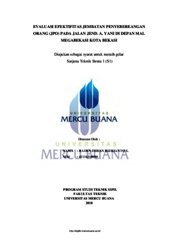 RIZKIANTO S., RADEN IMRAN (2018) EVALUASI EFEKTIFITAS JEMBATAN PENYEBEREANGAN ORANG (JPO) PADA JALAN JEND. A. YANI DI DEPAN MAL MEGABEKASI KOTA BEKASI. S1 thesis, Universitas Mercu Buana Bekasi.