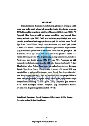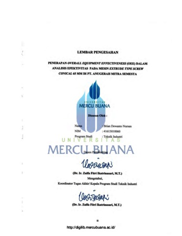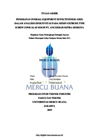 NURSAN, BRIAN DEWANTO (2019) PENERAPAN OVERALL EQUIPMENT EFFECTIVENESS (OEE) DALAM ANALISIS EFEKTIVITAS PADA MESIN EXTRUDE TYPE SCREW CONICAL 65 MM DI PT. ANUGERAH MITRA SEMESTA. S1 thesis, Universitas Mercu Buana Jakarta.