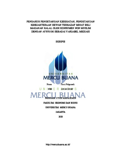 PALGUNADI, YOSSI (2020) PENGARUH PENGETAHUAN KESEHATAN, PENGETAHUAN KESEJAHTERAAN HEWAN TERHADAP MINAT BELI MAKANAN HALAL OLEH KONSUMEN NON MUSLIM DENGAN ATTITUDE SEBAGAI VARIABEL MEDIASI. S1 thesis, Universitas Mercu Buana.