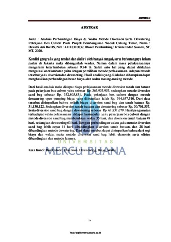 ABSTRAK Judul : Analisis Perbandingan Biaya & Waktu Metode Diversion Serta Dewatering Pekerjaan Box Culvert Pada Proyek Pembangunan Waduk Cakung Timur, Nama : Dewitri Asti Ifo HS, Nim : 41118310032, Dosen Pembimbing : Irriene Indah Susanti, ST, MT, 2020. Kondisi geografis yang rendah dan dialiri oleh banyak sungai, serta berkurangnya kolam parkir di Jakarta maka dibangunlah waduk. Namun dalam masa pelaksanaannya mengalami keterlambatan sebesar 9.74 %. Salah satu hal yang dapat dilakukan mengatasi keterlambatan yaitu dengan pemilihan metode perlaksanaan. Adapun metode tersebut yaitu diversion dan dewatering. Hasil analisis yang dilakukan diharapkan dapat menghasilkan perbandingan besar biaya dan waktu masing-masing metode. Dari hasil analisis maka didapat biaya pelaksanaan metode diversion tanah dan batuan pada pekerjaan box culvert yaitu sebesar Rp. 363,935,953, sedangkan metode diversion sand bag sebesar Rp. 332,805,831. Pada pekerjaan box culvert dengan metode dewatering open pumping biaya yang dibutuhkan ialah Rp. 394,637,510. Dari data tersebut disimpulkan bahwa selisih biaya diversion sand bag dan tanah batuan Rp. 31,130,122. Sedangkan diversion tanah batuan dan dewatering sebesar Rp. 30,701,557. Serta diversion sand bag dengan dewatering sebesar Rp. 61,831,679. Hasil pengamatan terhadapat waktu pelaksanaan didapat kesimpulan yaitu pekerjaan box culvert dengan metode diversion sand bag membutuhkan waktu 35 hari, dan diversion tanah batuan 49 hari, sedangkan dewatering 63 hari. Dengan perbandingan waktu yaitu metode diversion sand bag lebih cepat 14 hari dibandingkan diversion tanah batuan, dan 28 hari dibandingkan metode dewatering. Dari data tersebut dapat disimpulkan bahwa dari segi biaya dan waktu, maka metode diversion sand bag lebih ekonomis serta efisien dibandingkan dua metode lainnya. Kata Kunci: Box Culvert, Diversion, Dewatering, Biaya, Waktu ABSTRACT Title : Analysis Of The Cost And Time Comparison Of Diversion Methods And Dewatering Of Box Culvert Work On The Cakung Timur Construction Of Reservoirs, Name : Dewitri Asti Ifo HS, Nim : 41118310032, Lecturer : Irriene Indah Susanti, ST, MT, 2020. Low geographical conditions and flowed by many rivers and the reduction of retention ponds in Jakarta, then built a reservoir. However, during the implementation period, it was delayed by 9.74%. One of the things that can be done to overcome delays is to choose a method of implementation. The method is diversion and dewatering. The results of the analysis are expected to produce a large comparison of the costs and time of each method. From the analysis results, the cost of implementing the method of soil and rock diversion in the box culvert work is Rp. 363,935,953, while the sandbag diversion method is Rp. 332,805,831. For box culvert work using open pumping dewatering method, the required cost is Rp. 394,637,510. From these data, it was concluded that the difference in the cost of diversion sandbag and rock soil was Rp. 31,130,122. While rock soil and dewatering diversion are Rp. 30,701,557. As well as sandbag diversions with dewatering of Rp. 61,831,679. The results of observations of the implementation time obtained the conclusion that the work of box culvert with sandbag diversion method takes 35 days, and rock soil diversion 49 days while dewatering 63 days. By time comparison the sandbag diversion method is 14 days faster than rock soil diversion, and 28 days compared to the dewatering method. From these data, it can be concluded that in terms of cost and time, the sandbag diversion method is more economical and efficient than the other two methods. Key words : Box Culvert, Diversion, Dewatering, Cost, Time