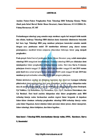 The development of increasingly advanced technology makes things easier and more efficient, the presence of BIM technology in the world of Indonesian construction supports new things. BIM technology makes construction work easy by creating 3D models that provide accurate information, but applying it is still not perfect, obtained by several factors which become obstacles. In the South Sulawesi project, the construction of a Boiler House Structure that has implemented BIM technology corrects delays. Evaluation of BIM technology was carried out in order to obtain an inhibiting factor on time performance. From the S Curve data the work plan starts on October 25, 2019 and ends on May 02 2019 but the actual progress data results only reach 84.6% on May 02 2019 and makes the project decrease by 15.4% of the total work progress. In conducting this analysis, questionnaires and field observations are carried out on related parties. To obtain the required data, after all obtained, the data analysis uses the SPSS program using Descriptive Analysis, Validity Test, Reliability Test, Reliability Test, Normality Test, t Test, F Test, Coefficient of Determination, and Residual Test. From the analysis results obtained the value of inhibiting factors on BIM on time performance Based on multiple linear regression analysis in obtaining dominant factors on BIM technology inhibitors of time performance namely Organizational factors, technical factors, personal factors, process factors, managerial factors, technological factors, policy, and legality factors. . Keywords: BIM technology, time performance delay, SPSS, Questionnaire, S curve, Construction Perkembangan teknologi yang semakin maju membuat segala hal menjadi lebih mudah dan efisien, hadirnya Teknologi BIM didalam dunia konstruksi diindonesia bukanlah hal baru lagi. Teknologi BIM yang membuat pekerjaan konstruksi semakin mudah dengan cara pembuatan model 3D memberikan informasi yang akurat namun penerapannya masihlah belum sempurna dikarenkan beberapa faktor yang menjadi penghambat. Pada proyek Sulsel barru2 pembuatan Boiler House Structure yang sudah menerapkan teknologi BIM mengalami keterlambatan. Evaluasi teknologi BIM pun dilakukan demi mendapatkan faktor penghambat terhadap kinerja waktu. Dari data Kurva S rencana pekerjaan dimulai tanggal 25 oktober 2019 dan berakhir tanggal 02 mei 2019 namun pada hasil data actual progres hanya mencapai 84.6% pada tanggal 02 mei 2019 dan membuat proyek terlambat sebanyak 15.4% total progres pekerjaan. Dalam melakukan analisis ini dilakukan kuesioner dan observasi lapangan terhadap pihak terkait demi mendapatkan data yang dibutuhkan, setelah semua didapatkan maka data di analisis menggunakan program SPSS dengan menggunakan Analisis Deskriptif, Uji Validitas, Uji Reliabilitas, Uji Normalitas, Uji t, Uji F, Koefisien Determinasi, dan Uji Residual. Dari hasil analisis didapatkan nilai faktor penghambat pada BIM terhadap kinerja waktu berdasarkan analisis regresi linear berganda di dapatkan faktor-faktor dominan terhadap penghambat teknologi BIM terhadap kinerja waktu yaitu faktor Organiasi, factor teknikal, faktor personal, faktor proses, faktor manajerial, faktor teknologi, faktor kebijakan, dan faktor legalitas. . Kata kunci : Teknologi BIM, keterlambatan kinerja waktu, SPSS, Kuesioner, Kurva S, Konstruksi
