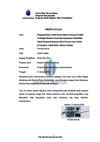 IRAWAN, NOVIDA (2010) PENGARUH DAYA TARIK PESAN DALAM KEMASAN PRODUK TERHADAP EKUITAS MEREK DAN KEPUTUSAN PEMBELIAN (Studi Mengenai Kemasan Botol Permen Lotte Xylitol di Carrefour Lebak Bulus Jakarta Selatan). S2 thesis, Universitas Mercu Buana Jakarta-Menteng.