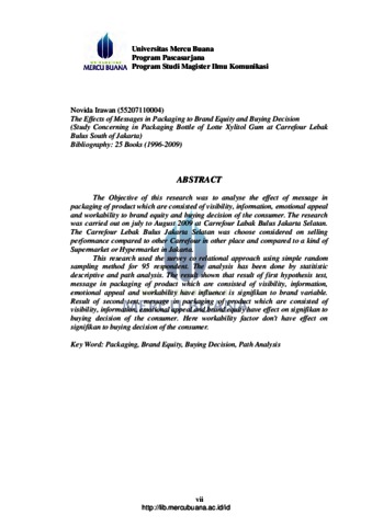 Penelitian ini bertujuan untuk menganalisis pengaruh daya tarik pesan dalam kemasan produk yang meliputi visibility, information, emotional appeal dan workability terhadap ekuitas merek dan keputusan pembelian konsumen. Penelitian dilaksanakan pada bulan Juli sampai Agustus 2009 di Carrefour Lebak Bulus Jakarta Selatan. Metode penelitian yang digunakan adalah survei berdasarkan kriteria, yaitu Carrefour Lebak Bulus Jakarta Selatan memiliki penjualan permen karet Lotte Xylitol yang paling tinggi dibandingkan Carrefour di wilayah lain di Jakarta serta dibandingkan dengan Supermarket atau Hypermarket sejenis yang ada di Jakarta. Penelitian ini menggunakan metode survei korelasional, penentuan sampel menggunakan simple random sampling dimana konsumen yang diambil sebagai responden sebanyak 95 orang. Analisis ini dilakukan dengan statistik deskriptif dan analisis jalur. Hasil hipotesis pertama berdasarkan hasil analisis jalur (path analysis) menunjukkan bahwa daya tarik pesan dalam kemasan produk yang terdiri dari visibility, information, emotional appeal dan workability mempunyai pengaruh yang signifikan terhadap variabel ekuitas merek. Hasil uji hipotesis kedua, berdasarkan hasil analisis jalur (path analysis) diketahui bahwa daya tarik pesan dalam kemasan produk yang terdiri dari visibility, information, emotional appeal dan ekuitas merek berpengaruh signifikan terhadap keputusan pembelian konsumen. Disini faktor workability tidak mempunyai pengaruh yang signifikan terhadap variabel keputusan pembelian konsumen. Kata Kunci: Kemasan, Ekuitas Merek, Keputusan Pembelian, Analisis Jalur The Objective of this research was to analyse the effect of message in packaging of product which are consisted of visibility, information, emotional appeal and workability to brand equity and buying decision of the consumer. The research was carried out on july to August 2009 at Carrefour Labak Bulus Jakarta Selatan. The Carrefour Lebak Bulus Jakarta Selatan was choose considered on selling performance compared to other Carrefour in other place and compared to a kind of Supermarket or Hypermarket in Jakarta. This research used the survey co relational approach using simple random sampling method for 95 respondent. The analysis has been done by statitistic descriptive and path analysis. The result shown that result of first hypothesis test, message in packaging of product which are consisted of visibility, information, emotional appeal and workability have influence is signifikan to brand variable. Result of second test, message in packaging of product which are consisted of visibility, information, emotional appeal and brand equity have effect on signifikan to buying decision of the consumer. Here workability factor don't have effect on signifikan to buying decision of the consumer. Key Word: Packaging, Brand Equity, Buying Decision, Path Analysis