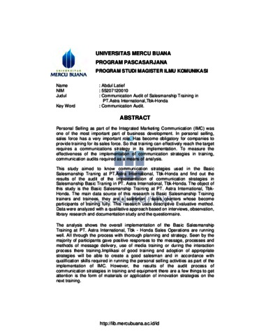 the most important part of business development. In personal selling, sales force has a very important role. Has become obligatory for companies to provide training for its sales force. So that training can effectively reach the target requires a communications strategy in its implementation. To measure the effectiveness of the implementation of communication strategies in training, communication audits required as a means of analysis. This study aimed to know communication strategies used in the Basic Salesmanship Traning at PT.Astra International, Tbk-Honda and find out the results of the audit of the implementation of communication strategies in Salesmanship Basic Traning in PT. Astra International, Tbk-Honda. The object of this study is the Basic Salesmanship Training at PT. Astra International, Tbk- Honda. The main data source of this research is Basic Salesmanship Training trainers and trainees, they are a salesman / sales counters whose become participants of training fully. This research uses descriptive Evaluative method. Data were analyzed with a qualitative approach based on interviews, observation, library research and documentation study and the questionnaire. The analysis shows the overall implementation of the Basic Salesmanship Training at PT. Astra International, Tbk - Honda Sales Operations are running well. All through the process with thorough planning and strategy. Seen by the majority of participants gave positive responses to the message, processes and methods of message delivery, use of media training or during the interaction process there training.Implikasi of good training and adoption of appropriate strategies will be able to create a good salesman and in accordance with qualification skills required in running the personal selling activities as part of the implementation of IMC. However, the results of the audit process of communication strategies in training and equipment there are a few things to get attention is the form of materials or application of innovation strategies on the next training. Personal Selling sebagai bagian dari Integrated Marketing Communication (IMC) adalah salah satu bagian terpenting dari perkembangan bisnis. Dalam personal selling, sales force memiliki peran yang sangat penting. Sudah menjadi kewajiban perusahaan untuk memberikan training bagi para sales force. Agar training dapat efektif mencapai sasarannya memerlukan strategi komunikasi dalam pelaksanaannya. Untuk mengukur efektifitas penerapan strategi komunikasi dalam training, diperlukan audit komunikasi sebagai alat analisanya. Penelitian ini bertujuan untuk mengetahui strategi komunikasi yang digunakan dalam Basic Salesmanship Traning di PT. Astra International,Tbk-Honda dan mengetahui hasil audit dari pelaksanaan strategi komunikasi dalam Basic Salesmanship Traning di PT. Astra International,Tbk-Honda. Objek penelitian ini adalah Basic Salesmanship Training di PT. Astra International,Tbk-Honda. Sumber data utama penelitian ini adalah para trainer Basic Salesmanship Training dan peserta training yaitu salesman / counter sales yang mengikuti training ini secara penuh. Penelitian ini menggunakan metode deskriptif evaluative. Data dianalisa dengan pendekatan kualitatif dengan berdasarkan wawancara, observasi, studi pustaka dan studi dokumentasi dan dengan kuesioner. Hasil analisis menunjukan secara keseluruhan pelaksanaan Basic Salesmanship Training di PT. Astra International, Tbk - Honda Sales Operation berjalan dengan baik. Semua proses dilalui dengan perencanaan dan strategi yang matang. Terlihat secara mayoritas peserta memberikan respon positif baik terhadap pesan yang disampaikan, proses dan metode penyampaian pesan, penggunaan media training maupun proses interaksi yang ada selama training.Implikasi dari Training yang baik dan penerapkan strategi yang tepat tersebut akan dapat menciptakan salesman yang baik dan sesuai dengan kualifikasi kemampuan yang dibutuhkan dalam menjalankan aktifitas personal selling sebagai bagian dari penerapan IMC. Namun demikian, hasil yang didapat dari proses audit strategi komunikasi dalam training tetap terdapat beberapa hal yang perlu mendapatkan perhatian yaitu berupa inovasi materi atau penerapan strategi pada training selanjutnya.